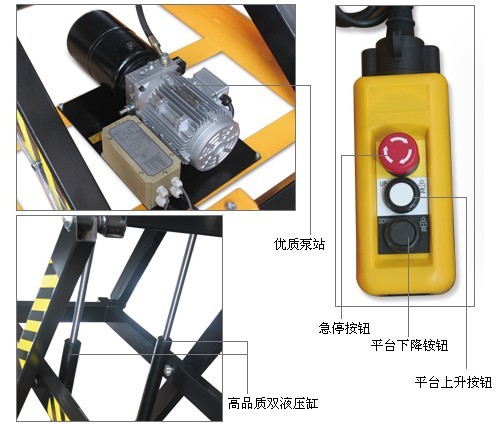 • 內部電源組配置有安全閥及補償流量開關,安全閥可以防止超負荷運作,補償流量開關可以控制低速,液壓系統帶防爆閥壓當油管爆裂時,可防止平臺急速下降;